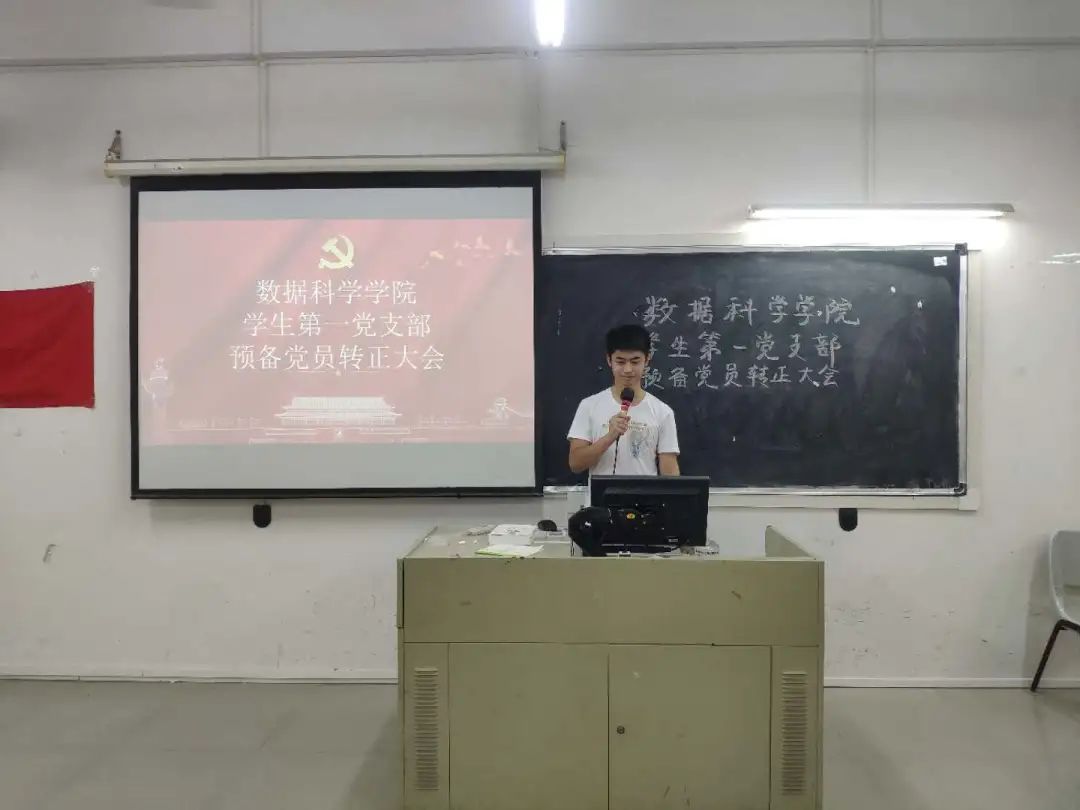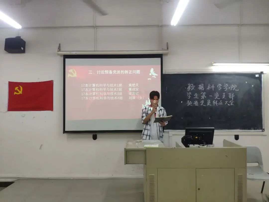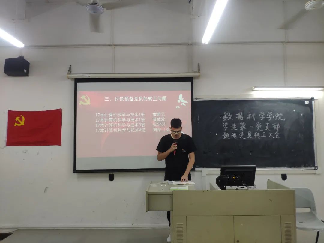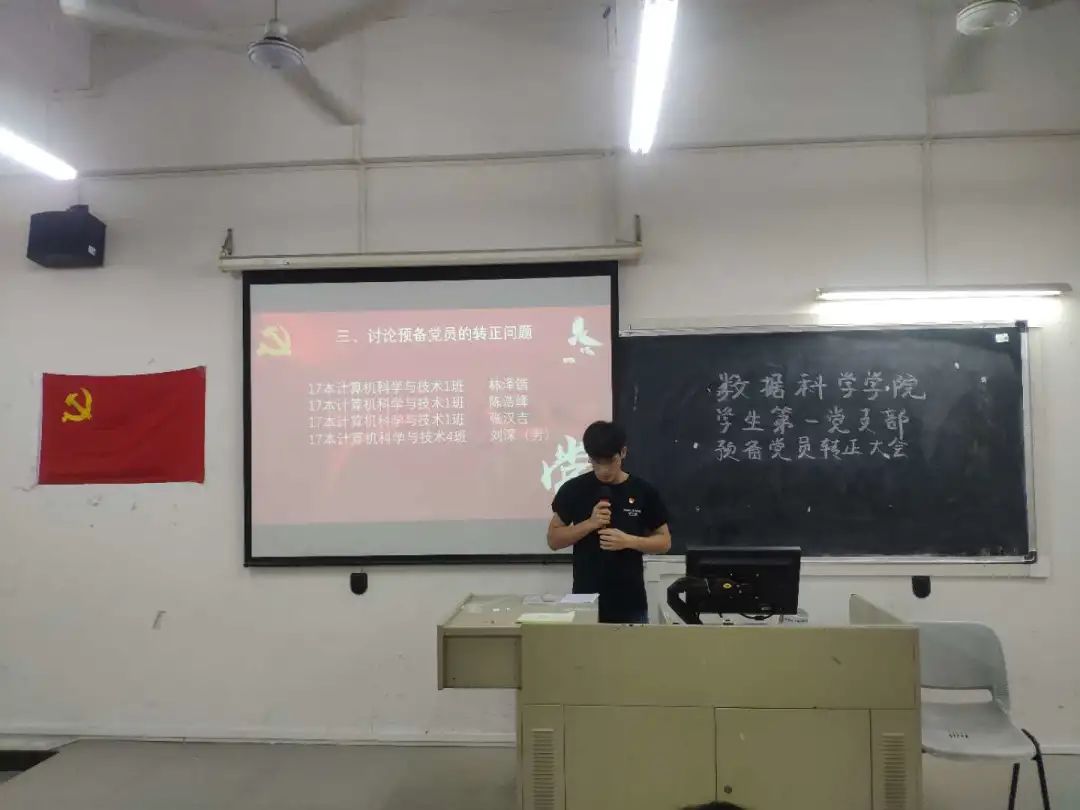 2020年9月9日19:30,数据科学学院学生第一党支部在厚德楼C312教室召开预备党员转正大会,大会由朱选宾同志主持,学生第一党支部书记谢朋涛老师、党支部全体党员参与了本次会议。