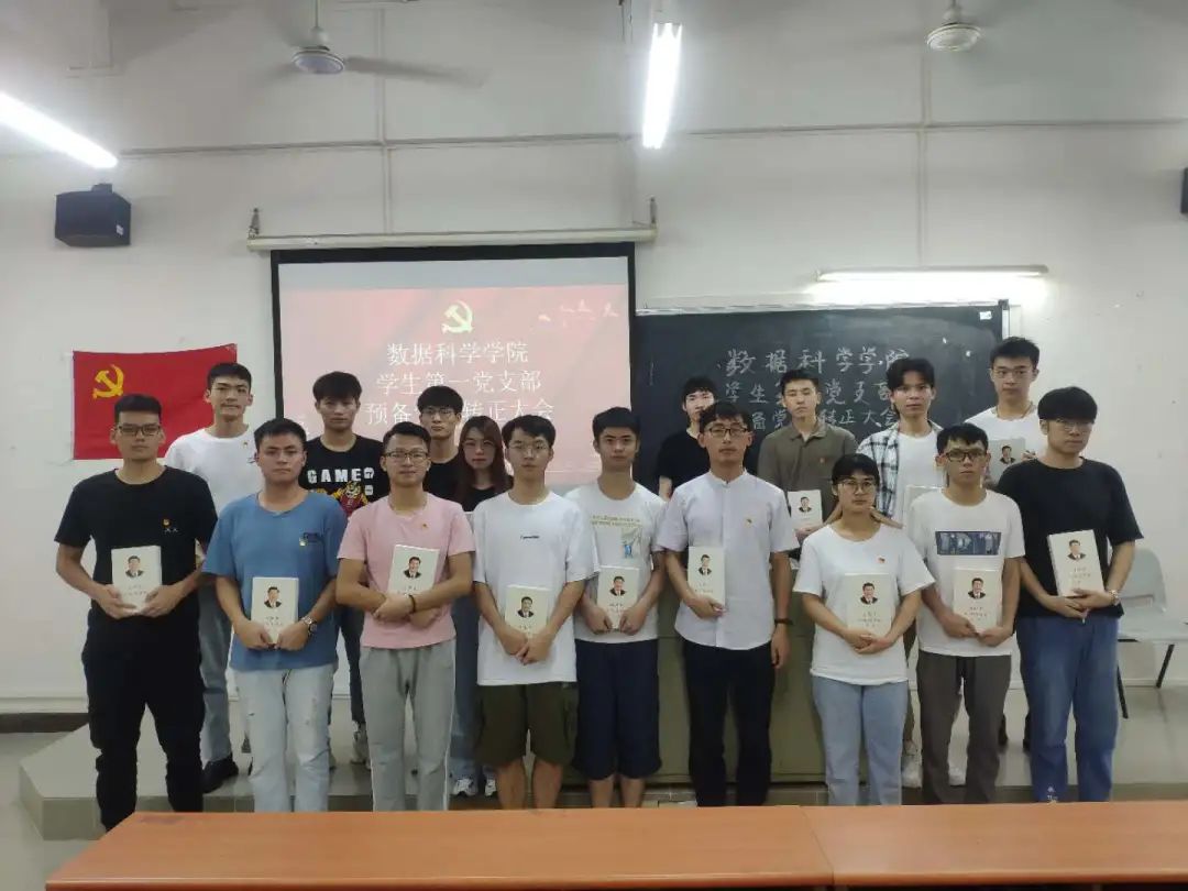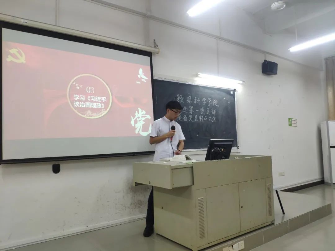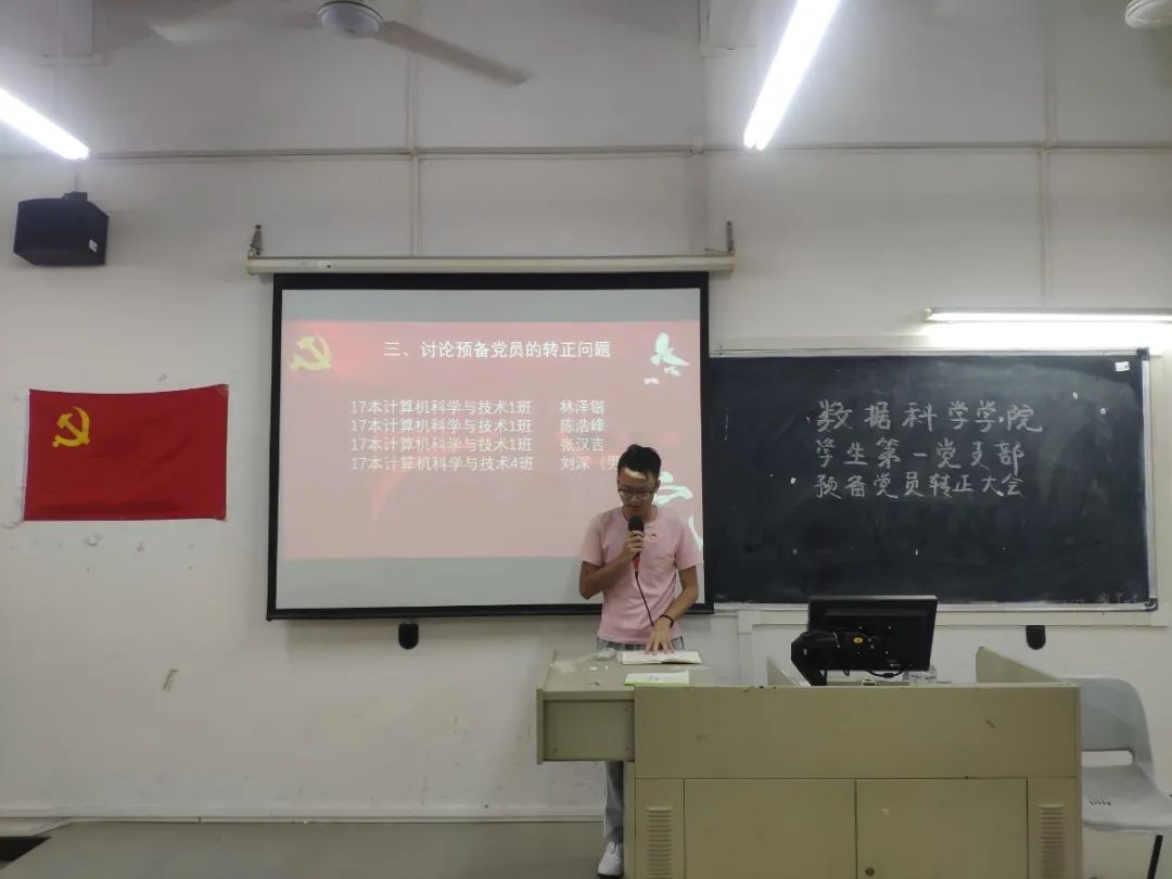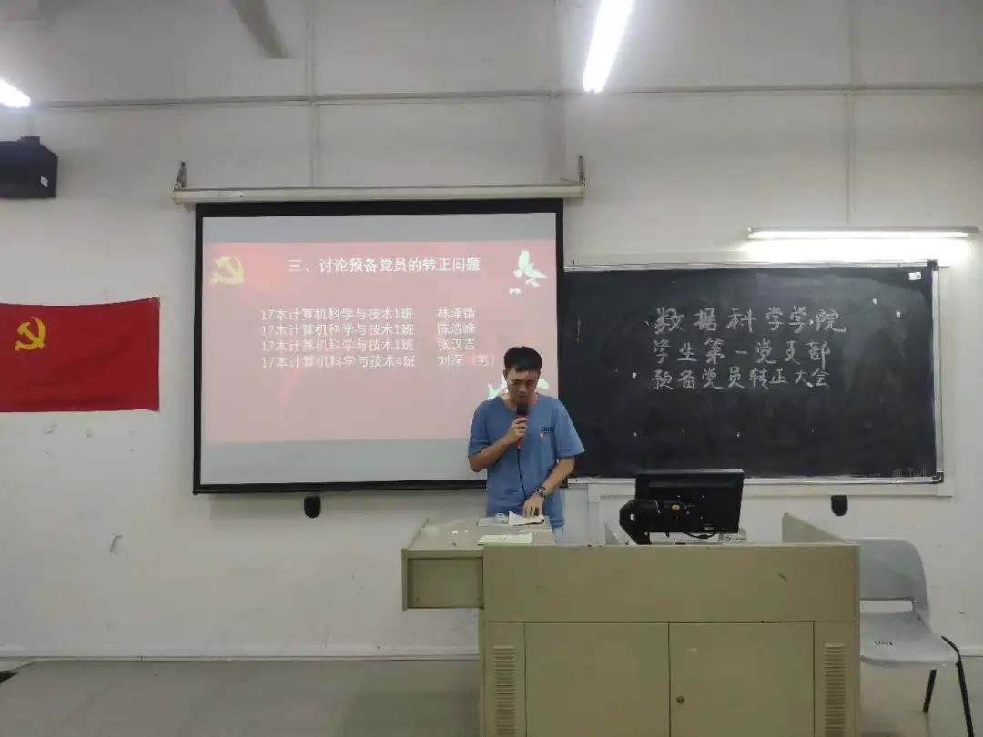 2020年9月9日19:30,数据科学学院学生第一党支部在厚德楼C312教室召开预备党员转正大会,大会由朱选宾同志主持,学生第一党支部书记谢朋涛老师、党支部全体党员参与了本次会议。