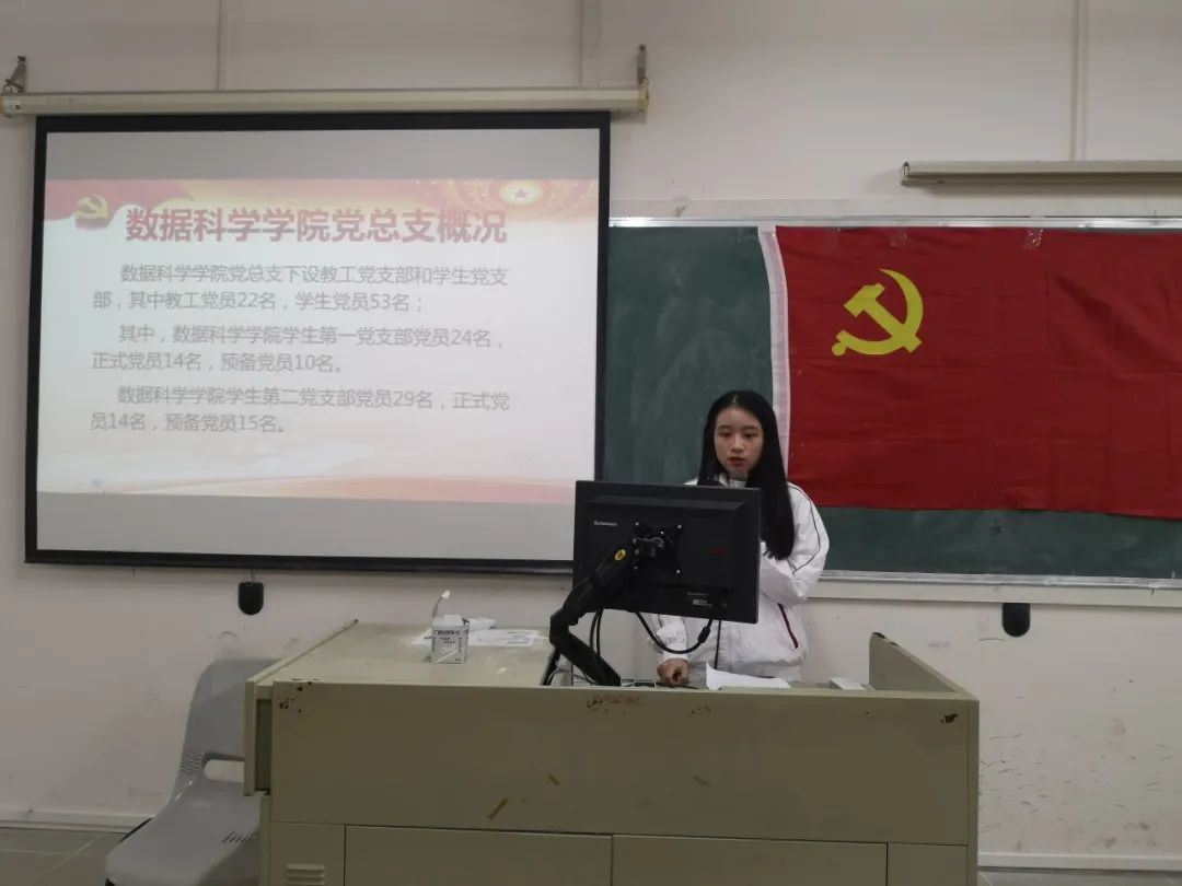 介绍党支部概况,数据科学学院党总支下设教工党支部和学生第一党支部、学生第二党支部。其中:教工党员22名,学生党员53名;学生第一党支部党员24名,正式党员14名,预备党员10名。学生第二党支部党员30名,正式党员16名,预备党员14名。