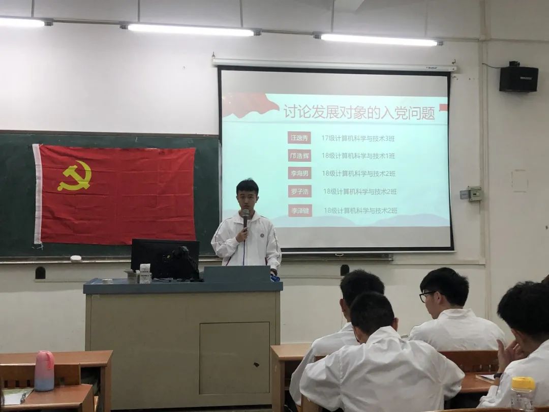 讨论发展对象的入党问题,16名发展对象依次上台宣读入党志愿书,他们将自己的具体信息和生活、学习等情况向党组织进行汇报,表示自己将会以党员的标准来严格要求自己,也希望自己可以在党组织的培养下,不断加强理论知识学习,严格践行党员标准,充分发挥党员的先锋模范作用。随后与会的正式党员讨论发展对象的发展问题,拥有表决权的党员逐一对16名发展对象进行不记名投票表决。经表决,一致同意接收汪逸秀等16名同志为中共预备党员。