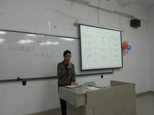 20121119星期一20:30,我系团总支学生会2012年校运会工作人员动员大会在创新楼E101顺利召开。此次大会的主要目的是在第六届校运会举办之前为团总支学生会各位工作人员做动员。我系党支部副书记蒋大锐、学生党支部书记蒋云丽、团总支书记、学生会指导老师王忍均出席了本次大会。