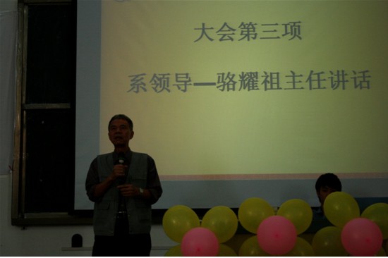 然后,信息工程系主任骆耀祖做了精彩的讲话,他对信息工程系团总支和学生会过去一学年的工作给予了高度的评价,并对即将当选的干部提出了明确的指导思想,他要求全体干部要紧紧围绕学院和全系的中心努力开展工作。特别是近阶段学院正处于评估最后阶段,各级干部都要发挥好模范带头作用,以饱满的热情和良好的状态迎接评估专家组的到来 。