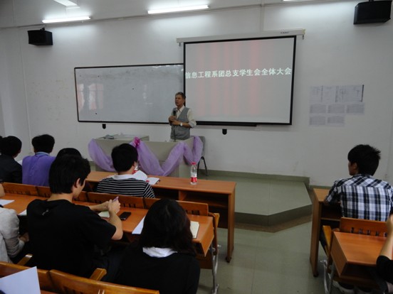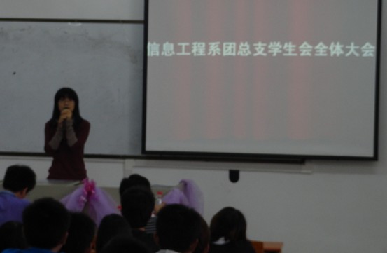 2011年11月8号,信息工程系团总支学生会全体大会在创新楼顺利召开。系主任骆耀祖,团总支书记、学生会指导老师吴泽佳,辅导员蒋云丽老师出席了会议,现任学生会秘书长徐翠萍主持大会。