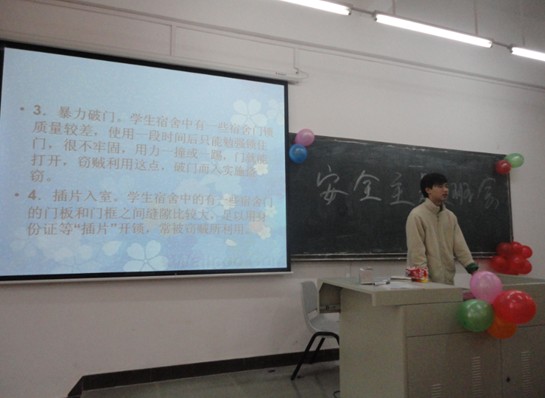 本次系列主题班会紧紧围绕宿舍安全用电、防火、防盗、校园环境、人身财产、心里健康等方面的安全问题展开学习与讨论。围绕相关案例及安全防范知识展开学习讨论。近年来校内外发生的学生安全意外事件案例,包括宿舍火灾、包车交通事故、饮酒猝死、外出安全、人身伤害等。通过“以案说法,以事警人”,有针对性的教育学生,帮助学生进一步克服麻痹思想,加强安全防范意识。特别是针对学生使用大功率电器的现象,做了特别的强调,并就安全使用电器和如何在火灾中进行有效防护作了重点教育。