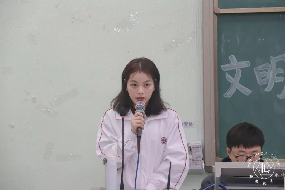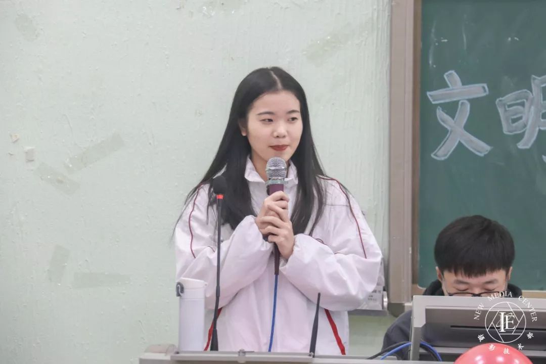 在观看完视频后,接着是文明安全纪律教育月工作总结。许洋洋同学上台作文明安全纪律教育月工作总结。她表示,本次文明安全纪律教育月工作主要从“文明安全主题班会学习”、“文明宿舍检查评比”、“签订遵守校规校纪承诺书”、“课堂纪律”、“卫生检查”这五个方面展开。在各个方面开展的工作中,同学们都积极参与和配合,从而让工作有序进行。同时,她也提到,在本次工作中发现同学的违规违纪现象明显减少,表明此次文明安全纪律教育取得一定成果,但是仍有一小部分同学还是存在违纪违规、不守文明的行为。最后,她希望所有同学向此次取得先进个人和先进班集体的同学和班级看齐,提高自身的安全防范意识和学习能力,共创美好数科院。