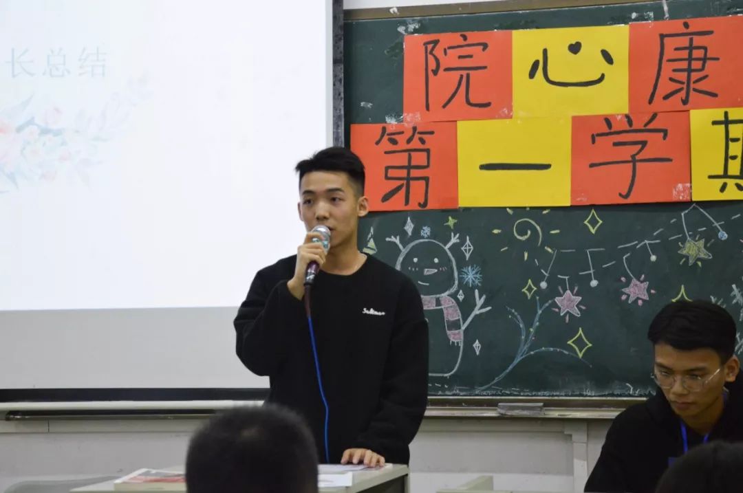 接着站长陈浩彬师兄作总结报告。陈浩彬师兄表示:转眼间就到学期末,看到视频中活动和团建的一张张照片,其实心里也蛮多感触。很高兴看到心康站每位成员收获到许多东西,但同时,工作中也有许多不足的地方。希望在接下来的工作里大家能够吸取此前的一些经验和教训,不断健全、不断创新、不断进步,力争充分发挥出我院心康站的作用。