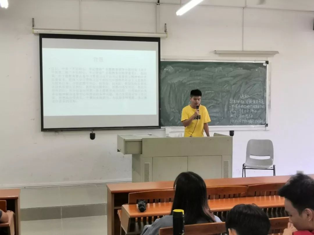 首先,班委为同学们介绍“不忘初心,牢记使命”的背景。并鼓励同学应该加强自己的专业知识,提高自己的能力,充实自己的生活,铭记自己的梦想,并时刻提醒自己要为之而奋斗。