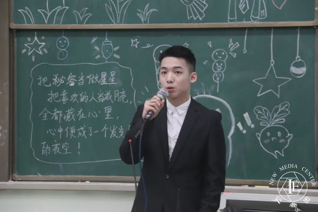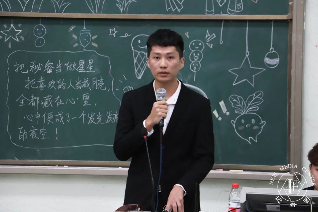 心理健康站部长代表周泳潮上台发言。首先,他希望同学们能把态度调整好,在部门的生活中成长、不断进步。其次,希望同学们能够把效率提到最高,把握时间,做到真正的“学习课余两不误。”最后,他希望同学们可以调节好自己的心态,自信、阳光地面对每一天。