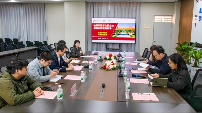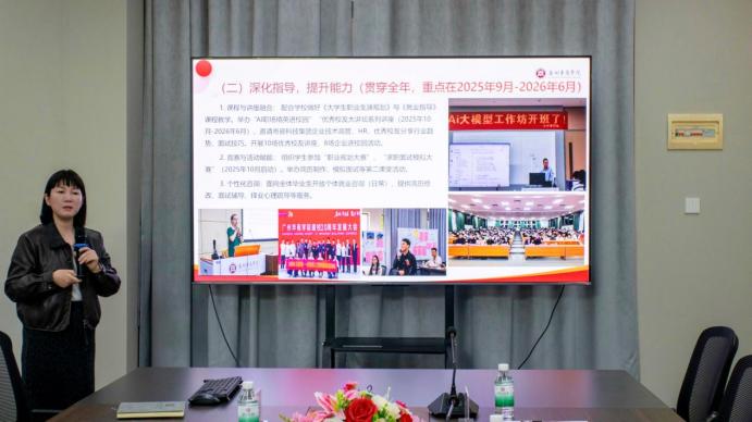随后,彭博娜主任学院当前就业工作开展情况进行汇报,主要从工作基础和形势研判、工作目标、工作计划和保障机制四个方面进行汇报,客观分析现阶段就业基本态势,梳理工作推进中的各类难点,介绍学院已开展的专场招聘、校友分享、一对一指导、双困生帮扶等系列举措,明确学院力争就业率走在学校前列的工作目标及后续具体工作计划。