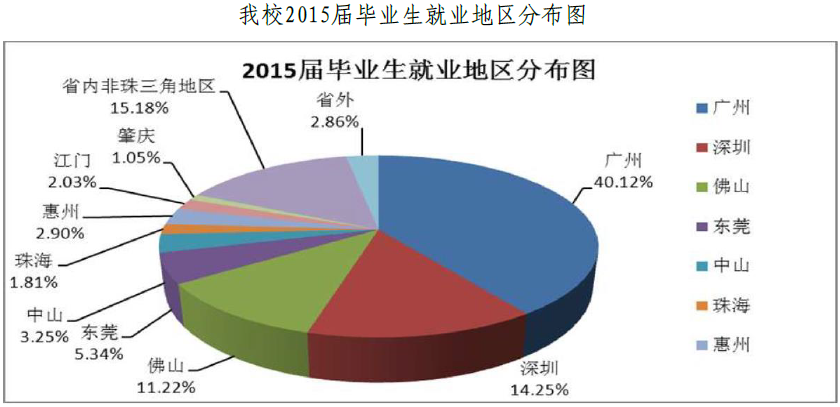截至 2015 年 9 月 1 日止,我校 2015 届已就业本科毕业生总数为4098 人,其中在珠三角地区就业的有 3359 人,占已就业本科生人数的81.97%;在省内珠三角地区以外的有 622 人,占全校已就业本科生人数15.18% ;在外省就业的有 117 人,占全校已就业本科生人数 2.85%。详情请参看下表。
