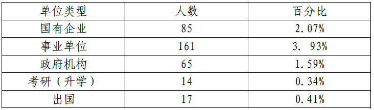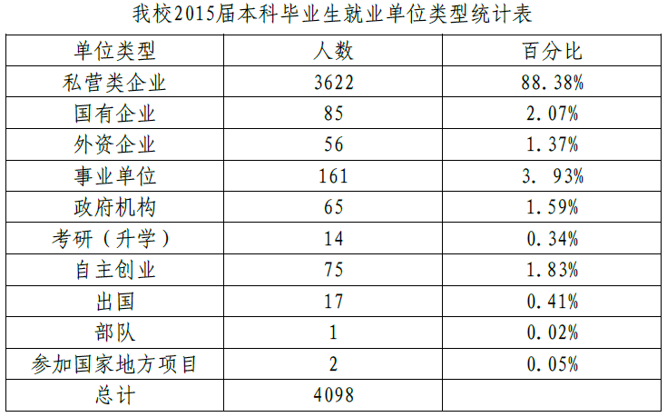目前,我校毕业生的就业主要集中在中小型企业,到政府机构、事业单位、国有企业就业的比例不高。我校将进一步优化人才培养模式,提高毕业生的综合素质,在保持高就业率的基础上,努力提升毕业生的就业层次。