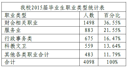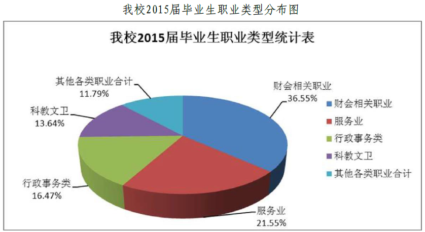 从职业类型分布来看,我校2015 届毕业生的职业类型,比例最高的为财会相关职业,占 36.55%;其次是服务业,占 21.55%,再次是行政事务类,占 16.47%,科教文卫类职业占 13.64%,其他各类职业合计11.79%。