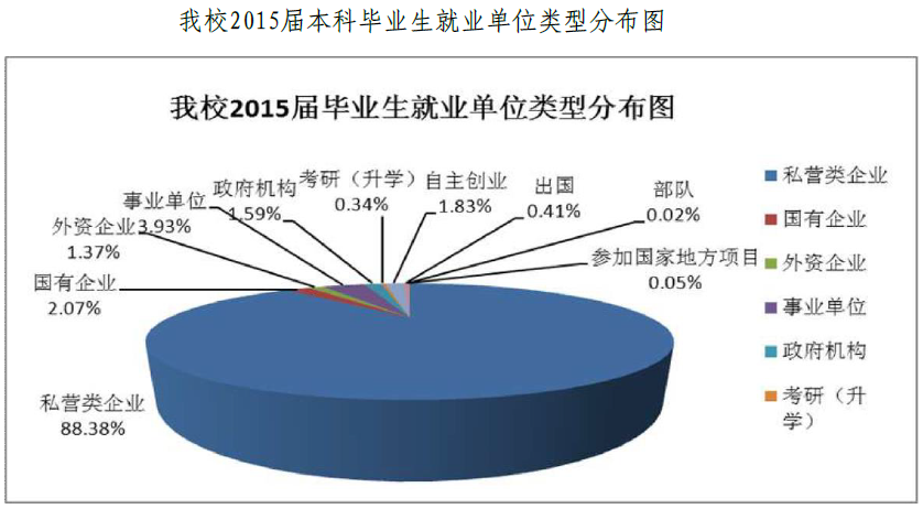 我校 2015 届毕业生到私营类企业就业的人数占已就业人数的88.38%,在各类型就业中占最高比重,私营类企业是我校毕业生最主要的就业流向。到国有企业和外资企业就业的人数不多,只占少量比例,分别为 2.07%和 3.93%。到政府机构工作(通过公务员考录和合同工等形式)的毕业生人数达 65 人,占 1.59%。