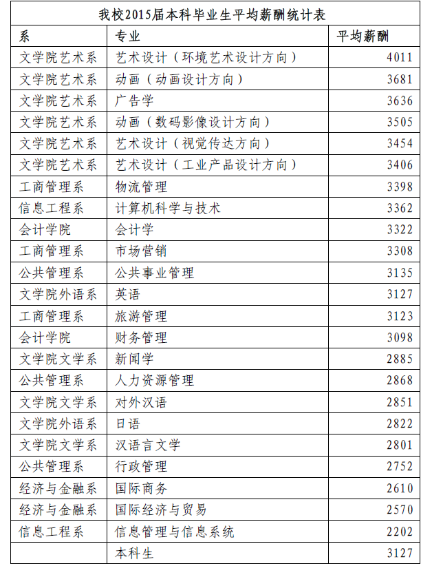 大学生就业在线院校应用系统中的数据显示,我校2015 年毕业生的平均薪酬约为 3127,其中最高的是艺术设计专业(环境艺术设计方向),平均薪酬 4011 元;其次是动画,为 3681 元;再次是广告学,为3636。因为此项数据统计时间刚好为毕业生入职的实习期或者试用期,数据显示为毕业生的入职工资,比毕业生实际薪酬低。中国北京大学市场与媒介研究中心和赶集网的研究院联合撰写的《就业主力军就业趋势研究报告》指出,2015 年 90 后毕业生的第一份工作的平均签约薪资为 2687 元人民币,我校大多数毕业生薪酬高于这个水平。