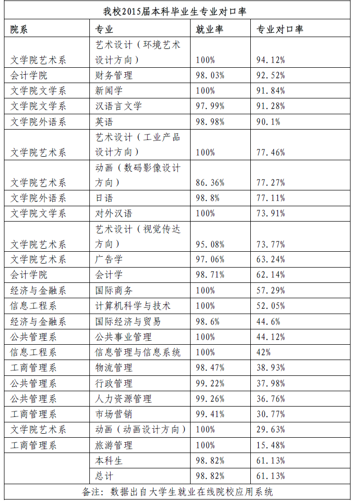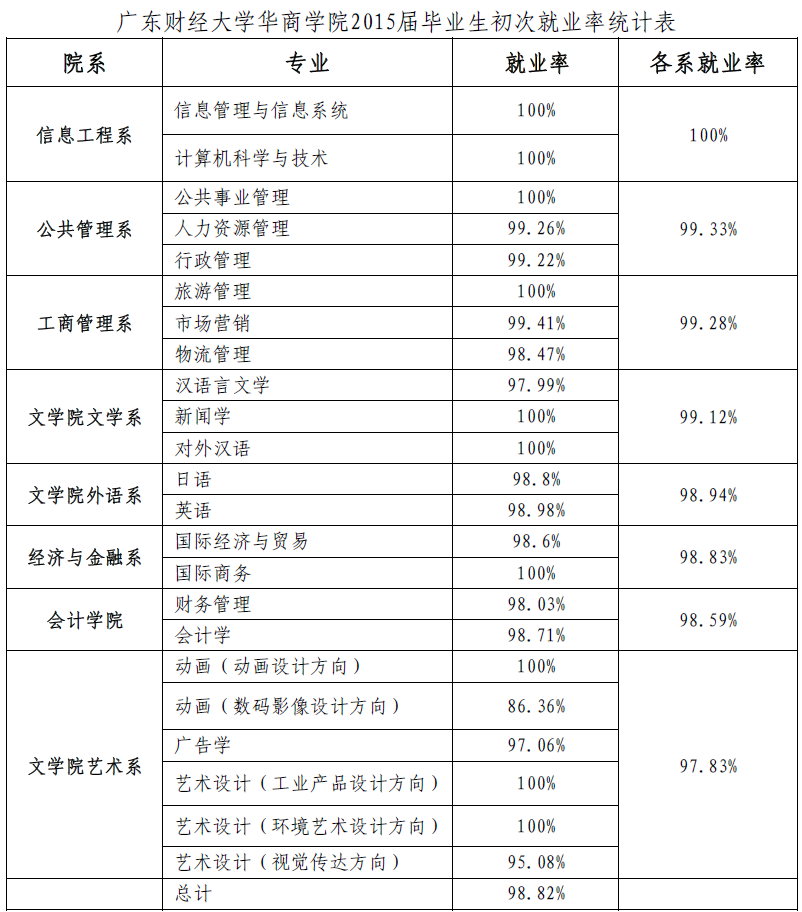 根据广东省教育厅粤教毕函【2015】35 号文,2015 年全省共有 49.35 万高校毕业生,截止 2015 年 9 月 1 日,我省 2015 年普通高等学校毕业生初次就业率为94. 80%(其中研究生为 90.19%,本科生为 94.08%,专科生为 95.91%)。我校 2015 届毕业生(均为本科)初次就业率为98.82%,高于全省的平均水平。