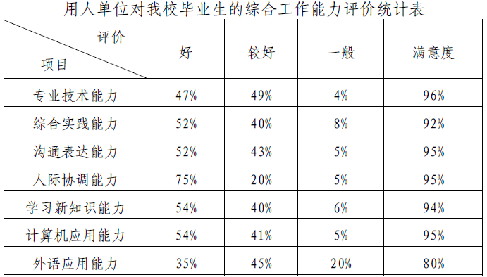 用人单位对我校本科毕业生专业技术能力、综合实践能力、沟通表达能力、人际协调能力、学习新知识能力、计算机应用能力等的满意度都比较高,对外语应用能力满意度较低。总的来说,用人单位对我校毕业生能力综合评价的满意率合计92%.请参看下表。