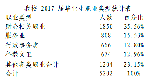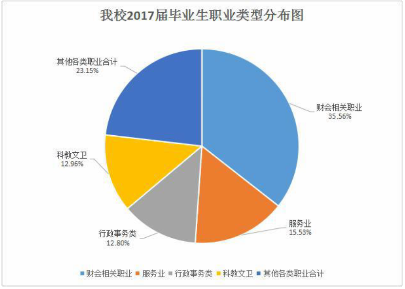 从职业类型分布来看,我校2017 届毕业生的职业类型,比例最高的为财会相关职业,占 35.56%;其次是其他各类职业,占 23.15%;再次是服务业,占 15.53%,科教文卫类职业占 12.96%,行政事务类占12.80%。