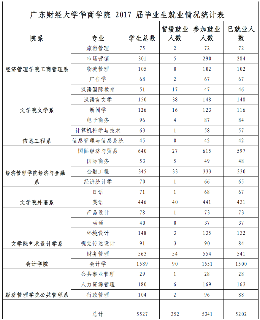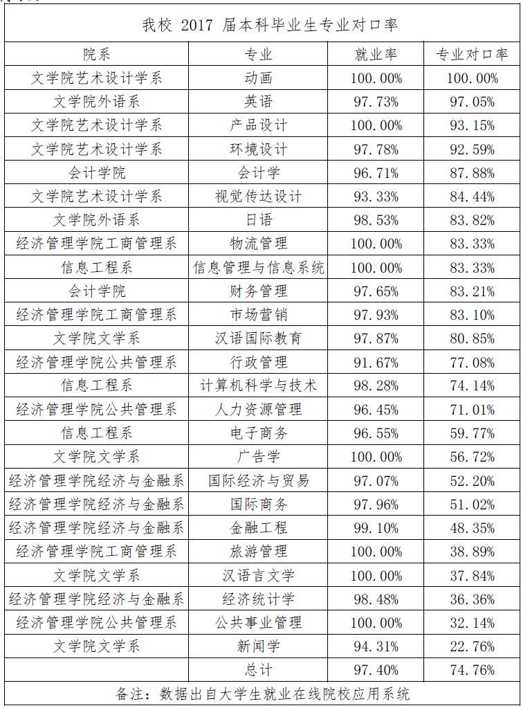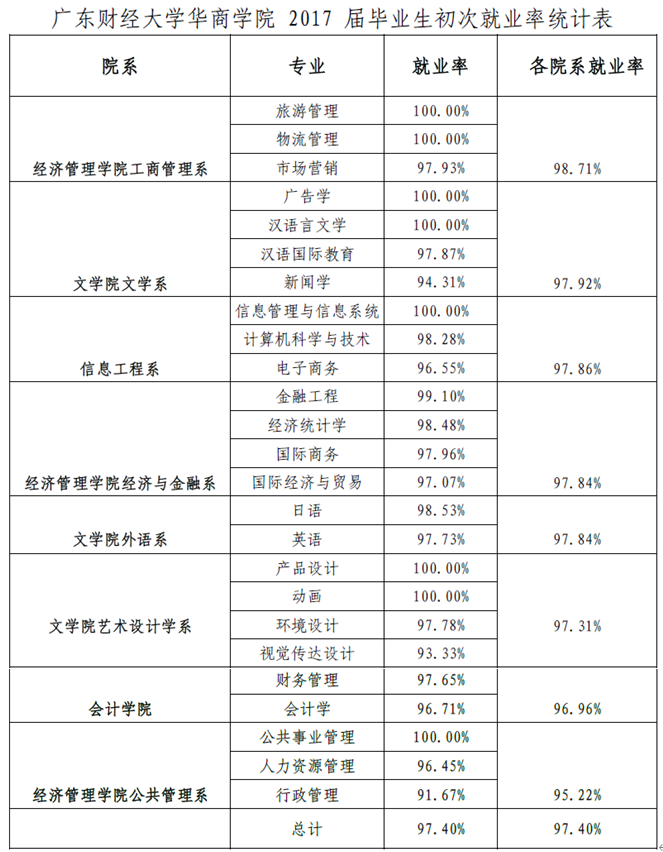 根据广东省教育厅粤教毕函【2017】36 号文,2017 年全省共有 52.86 万名高校毕业生,截止 2017 年 9 月 1 日,我省 2017 年普通高等学校毕业生初次就业率为95.10%(其中研究生为 92.88%,本科生为 94.99%,专科生为 95.40%)。我校 2017 届毕业生(均为本科)初次就业率为97.40%,高于全省的平均水平。