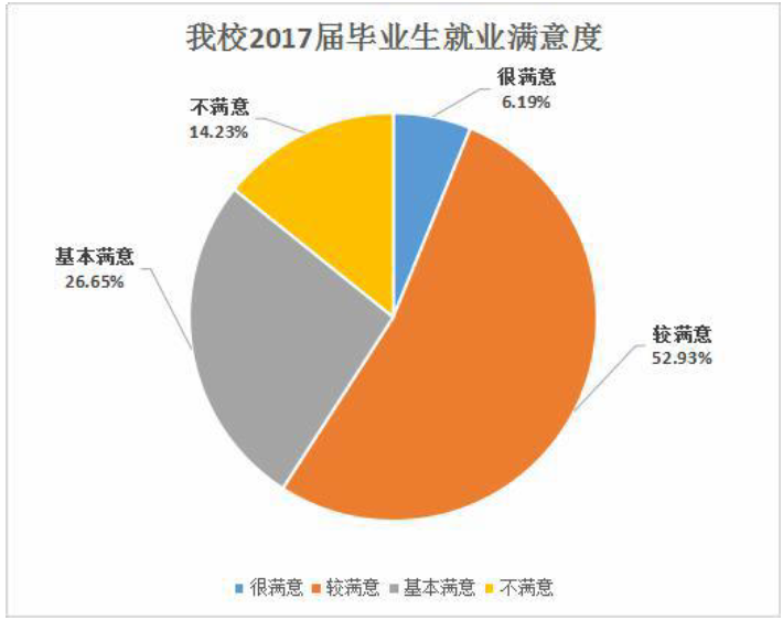 根据我校对 2017 届毕业生开展的就业满意度调查,毕业生对目前工作感到很满意的比例为 6.19%,较满意的为 52.93%,基本满意的为26.65%,就业满意度合计 85.77%。