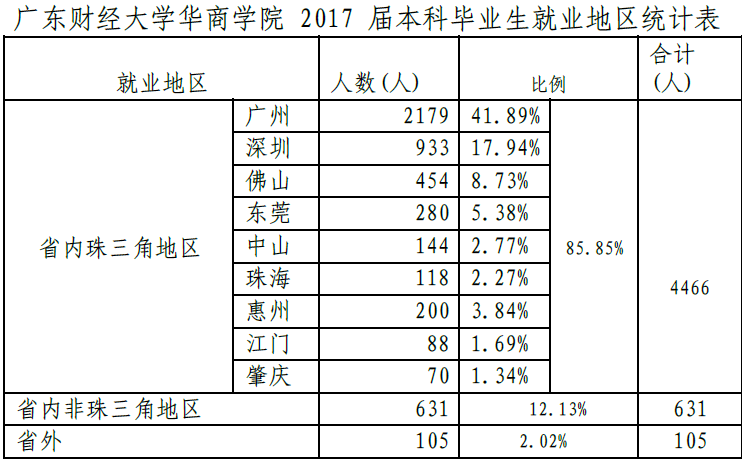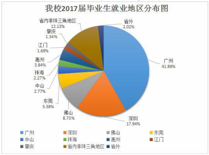 截至 2017 年 9 月 1 日止,我校 2017 届已就业本科毕业生总数为5202 人,其中在珠三角地区就业的有 4466 人,占已就业本科生人数的85.85%;在省内珠三角地区以外的有 631 人,占全校已就业本科生人数 12.13% ;在外省就业的有 105 人,占全校已就业本科生人数2.02% .详情请参看下表。