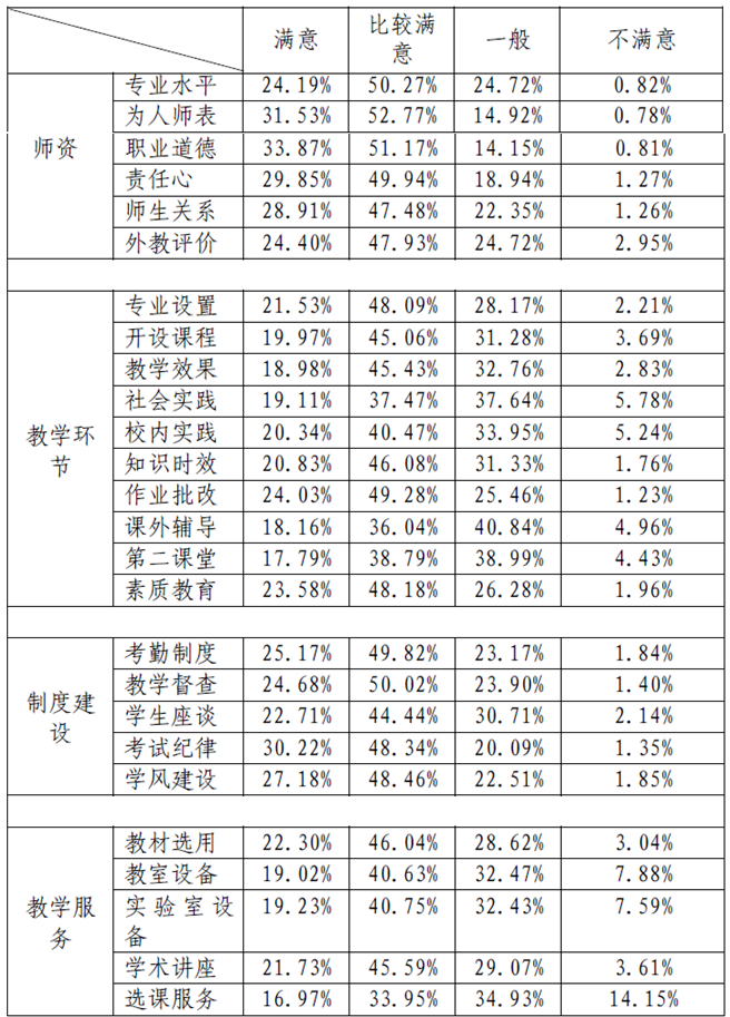 此次调查发出毕业生作答问卷5341 份,回收问卷 4806 份,取其中 2439 份问卷进行统计和数据分析。结果显示,毕业生对我校教学中的师资、教学环节、制度建设、教学服务等方面的满意度较高,对我校的教学效果也较为认可。