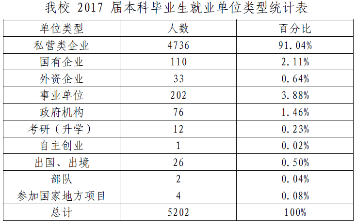 目前,我校毕业生的就业主要集中在中小型企业,到政府机构、事业单位、国有企业就业的比例不高。我校将进一步优化人才培养模式,提高毕业生的综合素质,在保持高就业率的基础上,努力提升毕业生的就业层次。