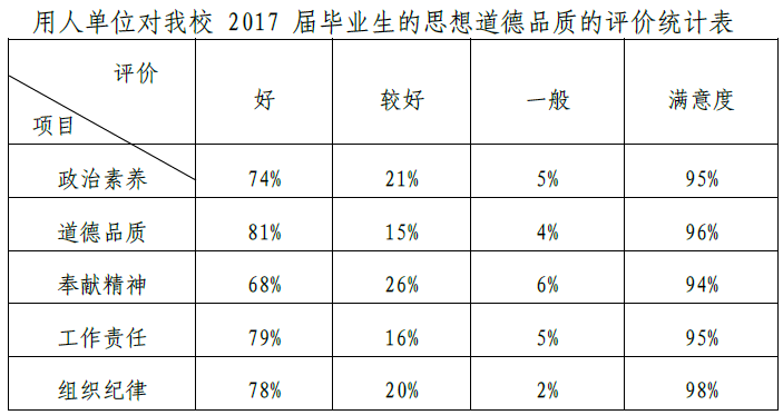 用人单位对我校本科毕业生各方面评价均比较高:政治素养、道德品质、奉献精神、工作责任、组织纪律等满意度均在 94%以上。请参看下表。