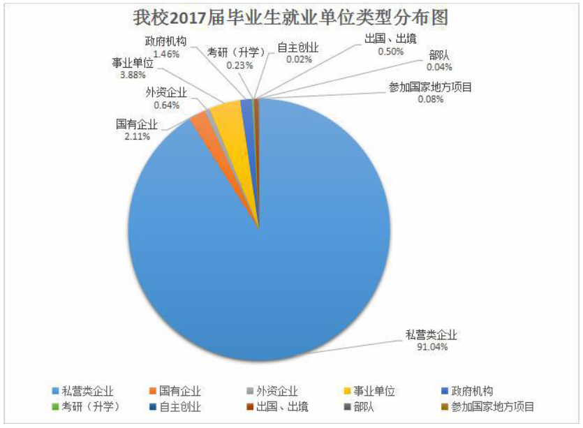 我校 2017 届本科毕业生就业主要流向为中小型企业,进入政府机构、事业单位、国有企业以及考上公务员、出国留学的比例较少。
