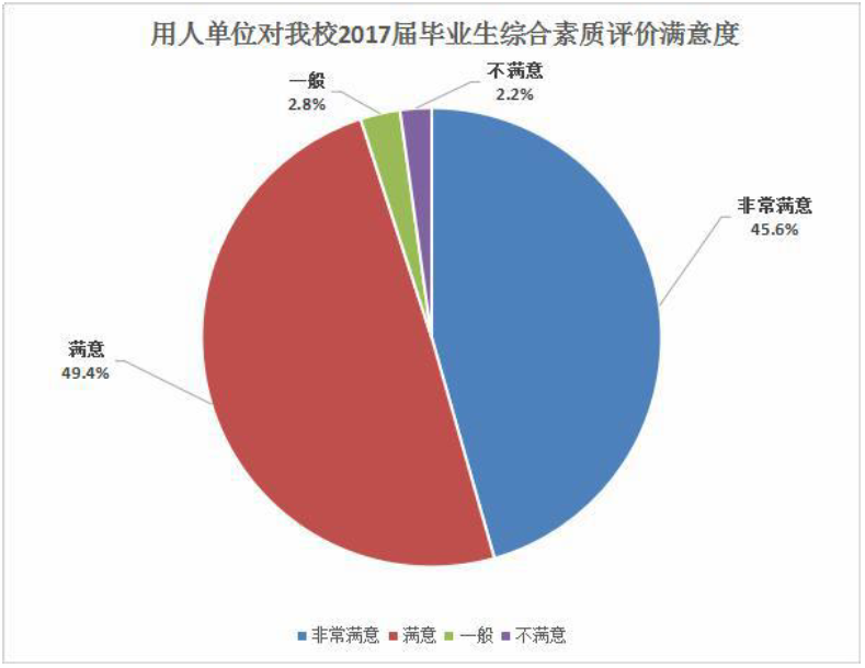 用人单位对我校毕业生综合表现非常满意为45.6%,满意为49.4%,满意度合计 95%,这说明我校毕业生的综合素质得到用人单位的认可,反映出我校教学质量良好。