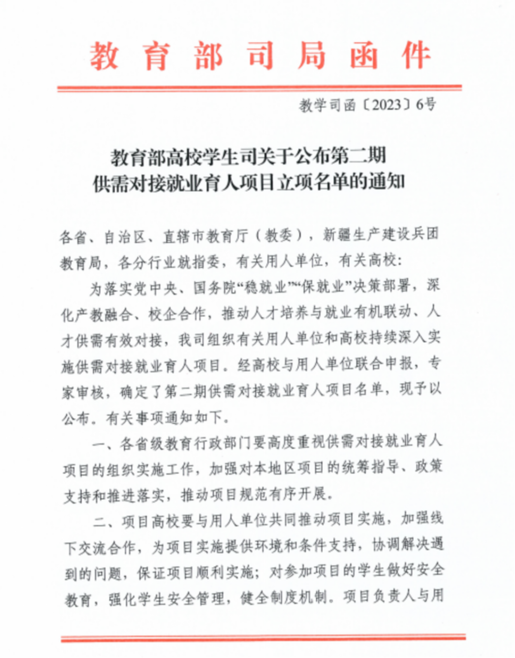为落实党中央、国务院“稳就业”“保就业”决策部署,深化产教融合、校企合作,推动人才培养与就业有机联动、人才供需有效对接,教育部高校学生司组织有关用人单位和高校持续深入实施供需对接就业育人项目。