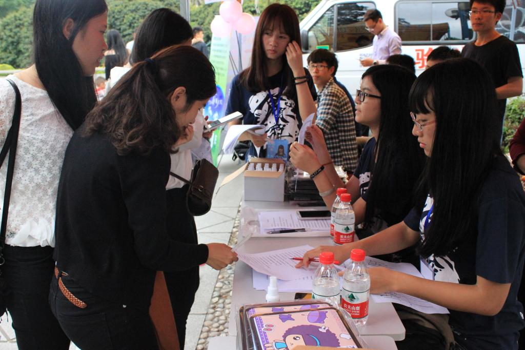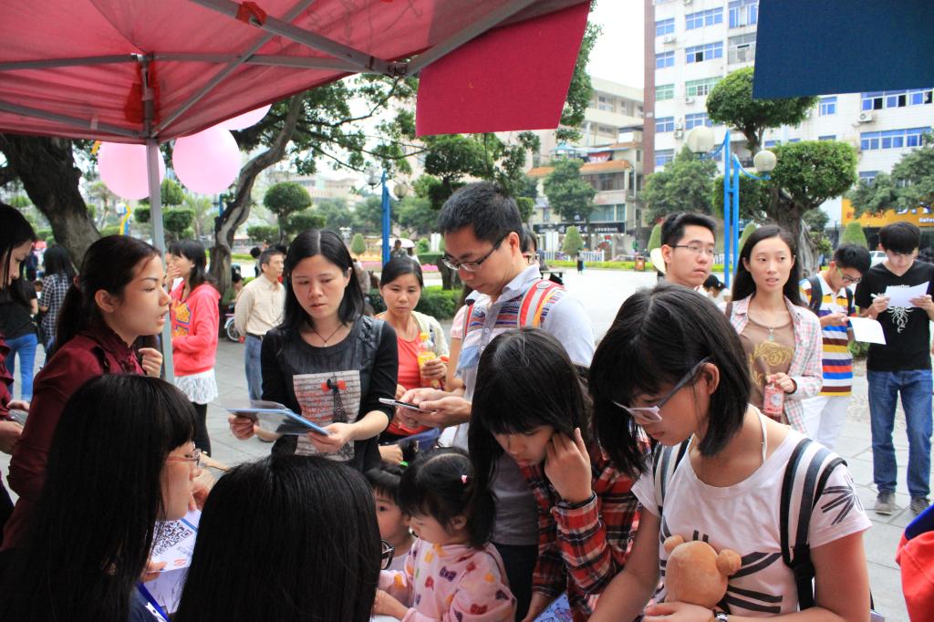 一切准备就绪,在场的工作人员开始着手自己的任务。在挂绿广场进行摆摊活动的是对本次活动所宣传知识较为熟悉的工作人员,他们为前来咨询的路人解答问题,并向他们讲解基本的家电使用小知识以及数码产品的使用技巧。其他工作人员及班级志愿者则是向过往的路人进行本次活动的宣传,派发小礼品来吸引过往的路人,用言语来拉动路人加入本次活动。还有不少路人积极参与有奖问答活动和调查问卷活动赢取精美小礼品,免费体验验光活动。