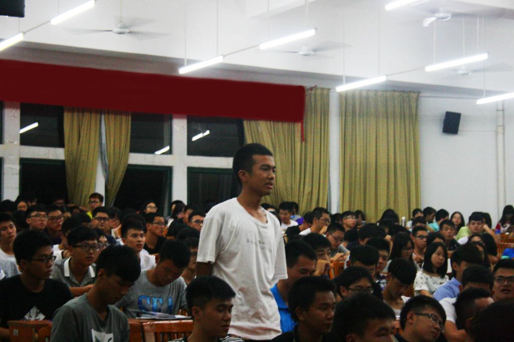在现场新生自由提问中,主持人的鼓励和老生代表的热情解答,使得现场的新生勇敢地站起来或走到讲台前对老生代表进行提问。新生提问的问题范围较广,如“大学里哪些元素最重要”、“在我们学校能否提前实习”、“华商的创业平台如何”等。蒋大锐老师上台进行大概的总结和解答新生疑问,整个活动现场透着浓厚的学术、好学的气息,掌声阵阵。