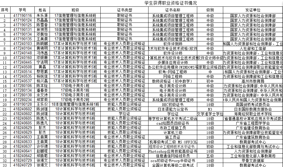 数据科学学院重视实践教学质量和学生实践能力的培养,组织学生参加省级以上各种竞赛和鼓励学生参加软考和各种企业认证考试,在师生的共同努力下,取得硕果成绩。