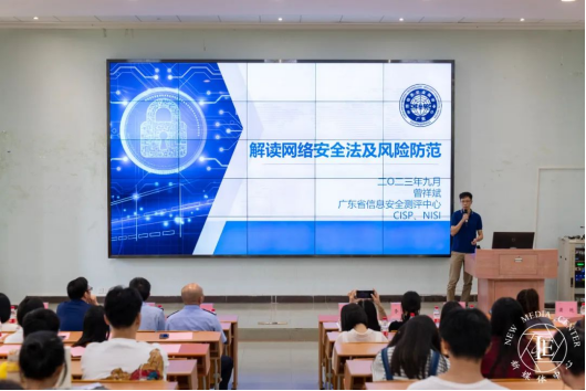 近几年,我国网络安全形势发生了非常大的变化,我国是名副其实的网络大国,网民人数全球第一,网络创新活跃,越来越多的业务都在互联网化,网络已融入经济社会生活的各个方面。但同时,我国也是网络安全事件的重灾区,网络攻击活动日渐频繁,个人信息泄露事件频发。因此《网络安全法》的出台,对于我们每个网络服务的提供者、网民都有非常积极的帮助。广东省信息安全测评中心研究员曾祥斌为全体师生解读网络安全法及风险防范,具体通过网络安全法出台的背景、网络安全法的主要内容、网络安全法禁止的八类活动和七种行为、网络安全法第一次修改内容以及主要违法风险等几个方面为大家进行解读。他提醒广大师生自觉遵守国家关于互联网管理的相关法律法规,增强政治敏锐性和政治鉴别力,正确认识、了解网络,以积极心态面对网络,让网络成为大学生成长学习的良师益友,最后对有志于从事网络安全职业的同学们的建议,一是要紧跟形势,学法懂法;二是要锻造技术,提升能力;