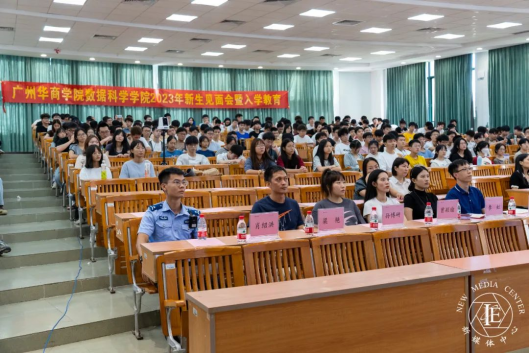 广东省信息安全测评中心研究员曾祥斌、李虹,增城区雁塔派出所副所长刘齐心、增城区雁塔派出所郭伟彬、梁灿锋,正佳集团朱民杰、丁军防、孙博研、曾颖瑜,党委后勤保卫处处长杨燕平、党委后勤保卫处梁艳,以及学院全体辅导员和全体新生参加活动。主题教育活动由2023级年级副主任耿艳利主持。