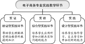 我们按照电子商务人才模式的要求,根据电子商务活动的基本特征,首先按“实证、实验、实践”三个模块设计本专业的实践教学活动。在“实证”模块中,通过参观、在线实操等验证型实践教学环节,帮助学生理解电子商务专业课程课堂理论教学所教授的知识;在“实验”模块中,通过商务活动模拟等综合型实践教学环节,培养学生应用所学知识解决实际问题的综合能力;在“实践”模块中,通过设计型实践教学环节,培养学生协作学习、自主学习和开拓创新的能力。如图2所示。