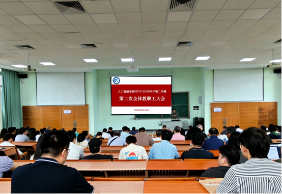 2026年3月31日下午,人工智能学院在励志楼D300召开2025-2026学年第二学期第二次全体教职工大会,全面部署合格评估工作及近期重点任务。会议由学院院长戴经国主持,副院长叶仕通、院长助理杨本胜及全体教职工参加会议。