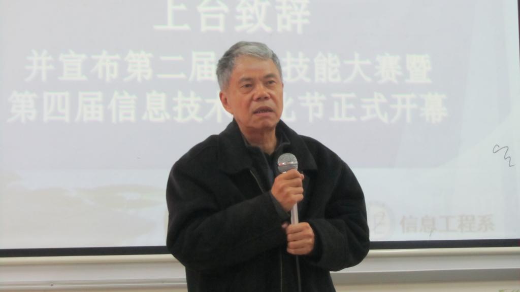 而后,参赛代表上台发言宣誓:参赛者将遵守比赛规则,诚信认真地进行竞赛。接着骆耀祖主任讲话指出,知识的牢固和设计的创新是非常重要的,学生应该要在学好知识的基础上,巧妙应用,提高专业的敏感性,即善于从身边事物联想到自己的专业知识。最后耀祖主任宣布:我系第二届专业技能大赛暨第四届信息技术文化节正式开幕!