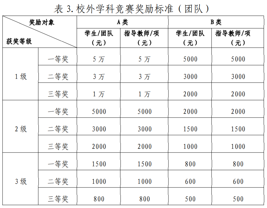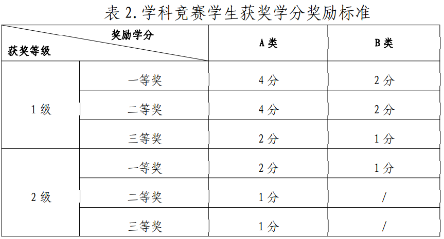 为了鼓励大家参与比赛,为学校和个人赢得荣誉,学校提供很好的奖励策略。学生如若获奖即可在学习上得到学校的认可如下表二,还能获得学校的现金奖励如下表三。