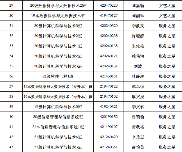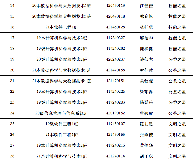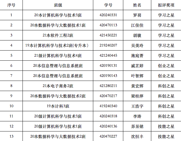 为深入贯彻习近平新时代中国特色社会主义思想,进一步培育和践行社会主义核心价值观,根据《关于评选第二届“校园之星”的通知》、《广州华商学院“十大校园之星”评选办法》等文件精神,数据科学学院开展了相关评优工作,现将学习之星、创业之星、科创之星、技能之星、公益之星、服务之星、体育之星、文艺之心拟评名单公式如下: