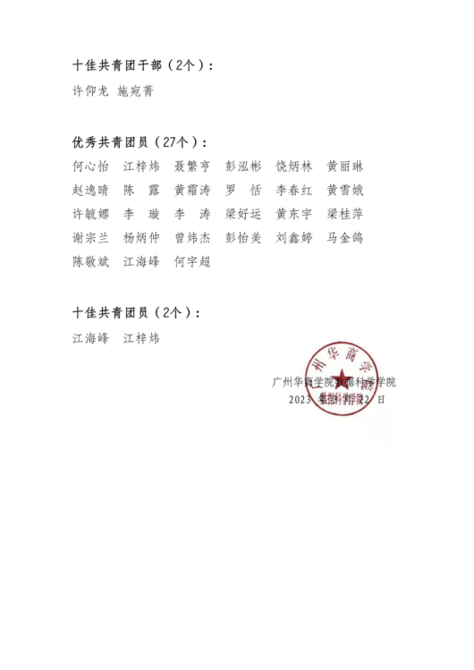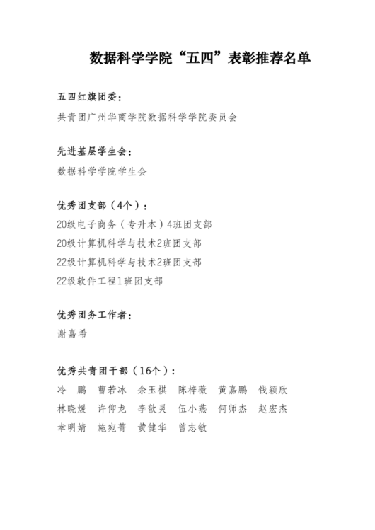 为深入学习贯彻宣传党的二十大精神,全面贯彻落实习近平总书记关于青年工作的重要思想,充分发挥先进典型的示范引领作用,激励各级团组织和广大团员、团干部锐意进取、争优创新,引导广大华商团员青年积极践行“奉献、友爱、互助、进步”的志愿服务精神,弘扬青春正能量,书写扎实推进中国式现代化建设的崭新篇章。根据校团委关于开展广州华商学院2022年度共青团“先进集体”和“优秀个人”评选表彰工作的要求,数据科学学院经过学生自主申报、资格审查、学院评议等程序,拟向学校团委推荐共青团广州华商学院数据科学学院学院委员会参评“五四红旗团委”;数据科学学院参评“先进基层学生会”;20级电子商务(专升本)4班团支部、20级计算机科学与技术2班团支部、22级计算机科学与技术2班团支部及22级软件工程1班团支部参评“优秀团支部”;谢嘉希参评“优秀团务工作者”;冷鹏等16人参评“优秀共青团干部”;许仰龙、施宛菁参评“十佳共青团干部”;何心怡等27人参评“优秀共青团员”;江海峰、江梓炜参评“十佳共青团员”。