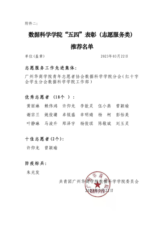 为深入学习贯彻党的二十大精神,全面贯彻落实习近平总书记关于青年工作的重要思想,引导广大华商团员青年积极践行“奉献、友爱、互助、进步”的志愿服务精神,弘扬青春正能量,充分发挥先进典型的示范引领作用,激励华商学院各级团组织和广大团员、团干部锐意进取、创先争优。根据校团委关于决定开展广州华商学院2022年度志愿服务工作“先进集体”和“优秀个人”评选的要求,数据科学学院通过学生自主申报、资格审查、学院评议等程序,拟向学校团委推荐广州华商学院青年志愿者协会数据科学学院分会(红十字会学生分会数据科学学院工作部)参评我校“志愿服务工作先进集体”;黄丽琳等18人参评“优秀志愿者”;许仰龙、曾颖瑜参评“十佳志愿者”;朱光发参评“防疫标兵”。