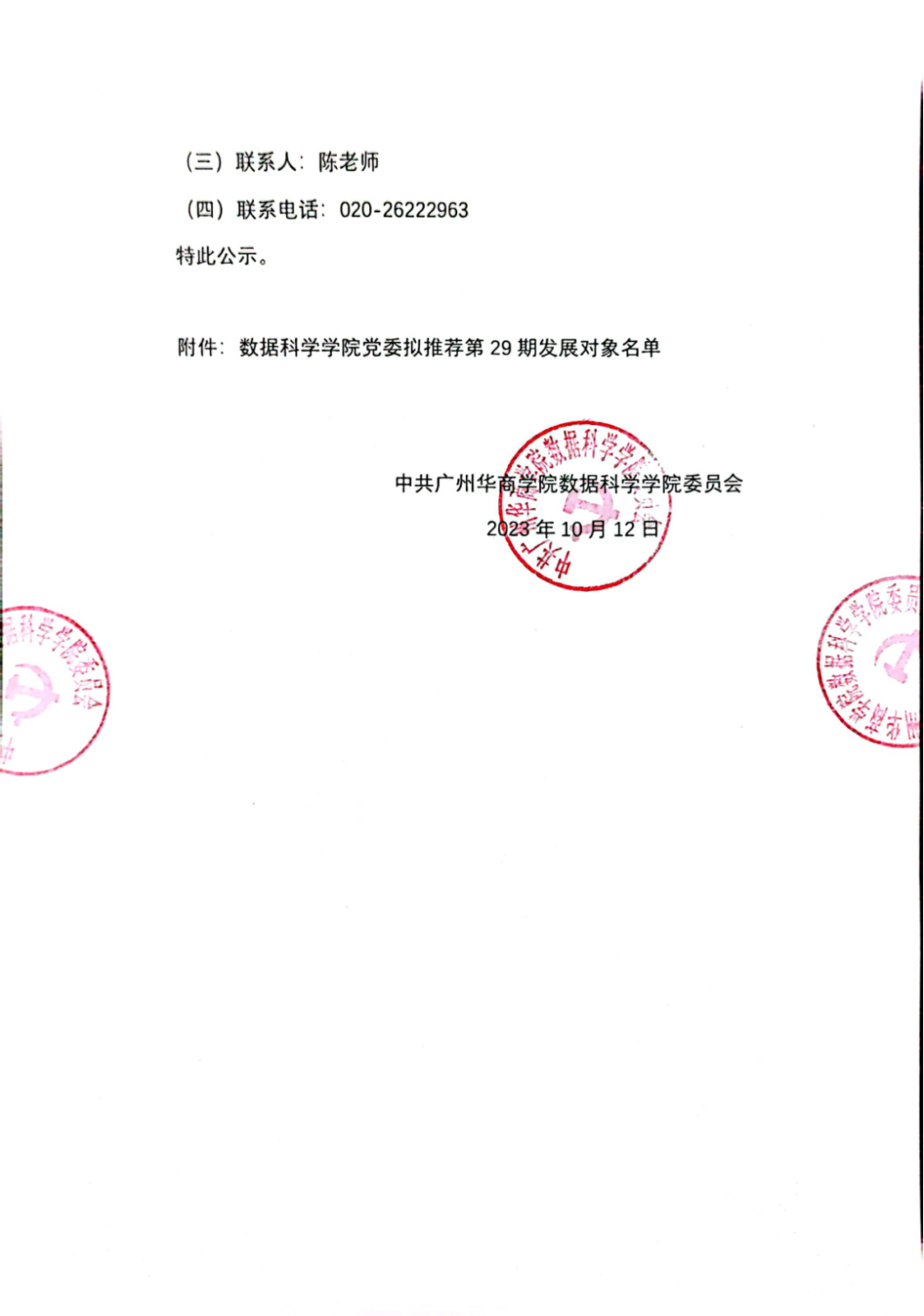 热点新闻 当前位置: 首页 >> 正文 广州华商学院数据科学学院党委拟推荐第29期发展对象名单公示 2023-10-13 根据《中国共产党章程》、《广州华商学院发展党员工作实施细则(试行)》等相关文件规定,结合组织工作实际情况,数据科学学院各基层党支部开展选拔入党积极分子举荐拟确定为发展对象。经过统一笔试、个人谈话、组织考察、综合考察材料、群众意见和推优工作小组及支委会研究讨论,并报学院党委审查,我院拟举荐何璐琪等22 名同志为第 29 期发展对象(具体名单见附件),现将有关情况予以公示,接受广大党员、群众监督。现予以公示如下: 上一条:关于开办人工智能大模型专家讲座的通知 下一条:学院资讯 | 数据科学学院2022-2023学年优秀学生干部初审名单公示 【关闭】