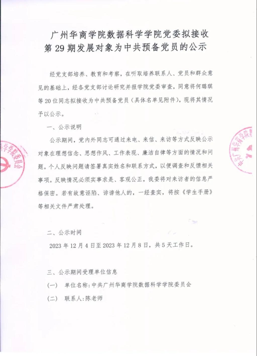 热点新闻 当前位置: 首页 >> 正文 广州华商学院数据科学学院党委拟接收第29期发展对象为中共预备党员名单公示 2023-12-04 经党支部培养、教育和考察,在听取培养联系人、党员和群众意见的基础上,经各党支部讨论研究并报学院党委审查,同意将何璐琪等20位同志拟接收为中共预备党员(具体名单见附件),现予以公示如下: 【关闭】