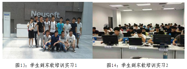 依托校企合作的校外实践教学基地,通过分批安排学生培训实习就业,打通高质量的就业通道。安排学生到东软、砺锋科技参加培训实习如图13-16所示。