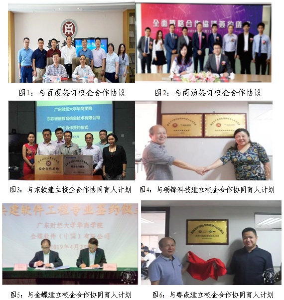 数据科学学院2014年开始,由校董事会和学院领导牵头,与省内外知名信息科技企业建立校企合作关系,并借助高校协同育人项目,与企业共同培养专业技术人才,与百度、商汤、东软睿道教育信息技术有限公司、广州砺锋信息科技有限公司、广州粤嵌通信科技股份有限公司,建立合作并挂牌,如图1-6所示,同时与阿里巴巴、华为、传智播客展开协同育人初步合作。