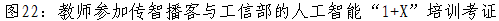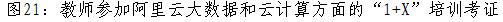 如图21-22所示,学院组织教师参加阿里巴巴1+X职业技能等级证书师资培训,参加传智播客1+X职业技能等级证书师资培训,建立校企双师团队,通过双师团队将企业与学校连接起来形成“实践共同体”,实现1+1>2的校企合作师资队伍建设模式,并开展校企合作交流、学生考证培训和竞赛指导、实践课程共建等工作。