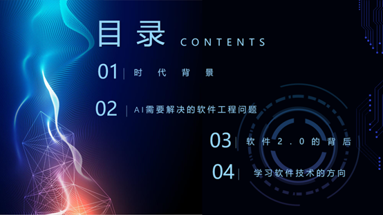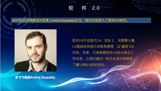 通过对比1.0,软件2.0在视觉识别、语音识别、语音合成、机器翻译、机器人技术、智能游戏等方面更加智能。其次,她认为用于软件开发的核心智能的驱动力在于数学、算法、编程语言、智能开发工具、智能辅助工具、操作系统等方面。