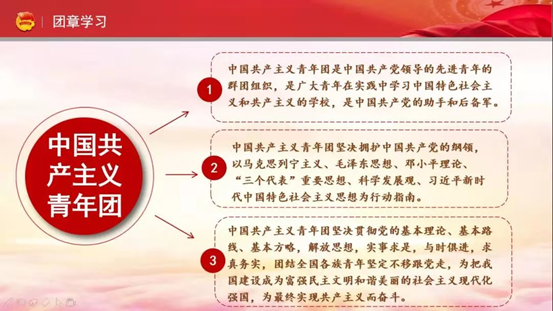 本次思想政治教育课按照团章学习、一学一做、时政五四、爱国主义教育四个环节展开。在“团章学习”这一环节中,黄比悉老师就团章的主要内容以及学习团章的的意义进行了简要的说明,随后带领同学们对团章进行详细的了解和学习,对中国共产主义青年团的发展史、团歌、团旗、团章、团徽等进行了讲解。