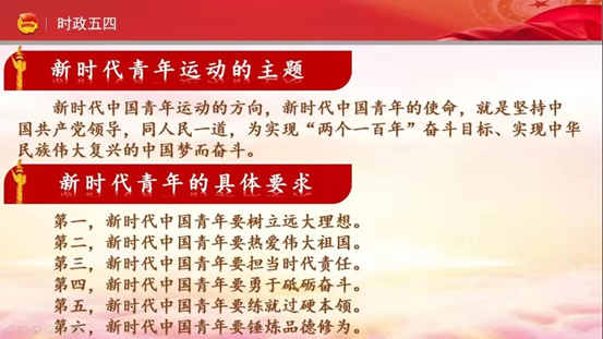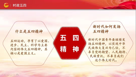 紧接着,他还给我们阐述了“时政五四”这一内容。他主要从五四新文化运动的历史引入这一概念,分析了五四新文化运动的地位、作用,随后又从“新时代如何发扬五四精神”的角度分析作为一名新时代青年的具体要求。他表示“爱国、进步、民主、科学”的五四精神永远不会过时。